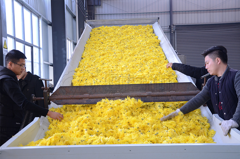 一次烘干的話,菊花外部花瓣可能會焦掉,而中心還是濕的,外焦內濕,我們采取分兩步的方法,第一次溫度控制在40-50攝氏度之間,烘掉一部分的水分,然后堆放12小時以上,使花朵內外水分均勻再進行第二次烘干,第二次烘干的溫度控制在45-50攝氏度之間。