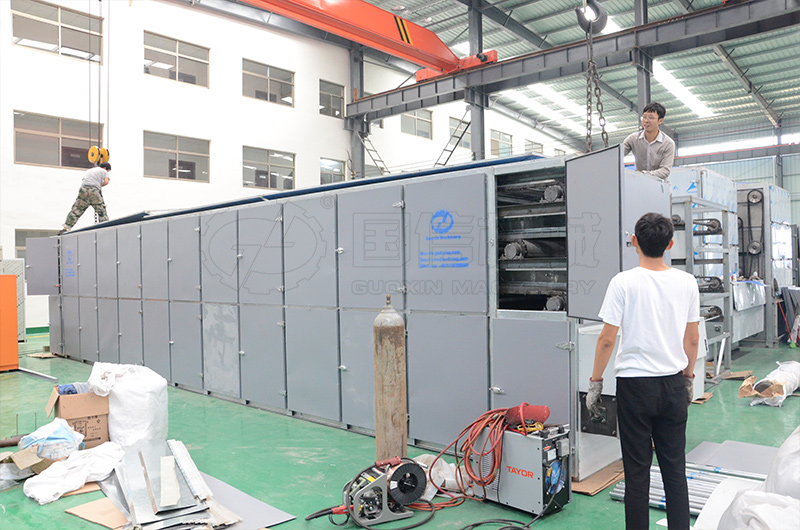 網帶式干燥設備設有冷卻層和震動輸料裝置,出料溫度低,有利于及時包裝;箱體外設有活動門,便于清理;還另配自動出料風冷裝袋設施,節省人工,方便快捷。