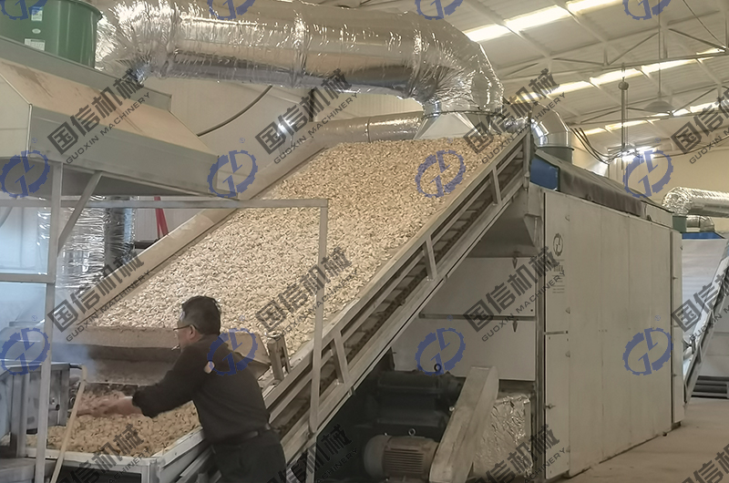 冷水漂洗:漂燙好的鱗片立刻投入氣泡清洗機的冷水中漂洗至冷,瀝干表面的水分。 熱風干燥:把瀝干表面水分的鱗片放入料斗內,經自動鋪料裝置送入百合烘干機上上層進行干燥,溫度控制在60-70℃,在網帶的帶動下,百合鱗片從上層往下層移動。運行中,百合片受到翻料器的翻動,同時,百合鱗片有多次往下落的過程,使百合鱗片翻動更徹底。最后,干燥至百合鱗片含水量至10%左右(手摸鱗片發脆為度),干燥好的百合干片從百合烘干機底層的出料口排出。