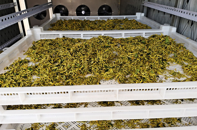 第三階段:溫度控制在50~54攝氏度,升溫時間控制在2~4個小時,此階段可以稍微降低排濕速度,以利于溫度提升,經(jīng)過第三階段金銀花基本已經(jīng)達(dá)到8成干;