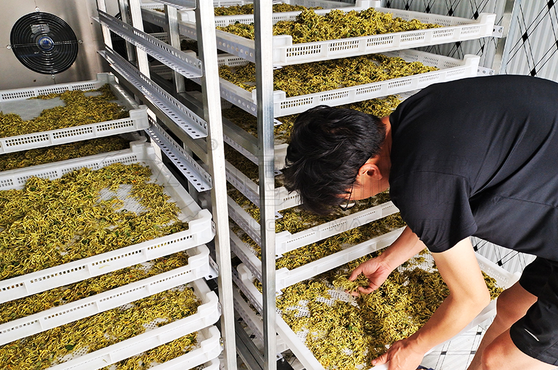 第二階段:烘干房溫度逐漸從41攝氏度提升至48攝氏度,此溫差的提升時間掌控在5~7個小時逐漸完成,一定不可超過50攝氏度的溫度范圍,同時保持同樣的排濕速度;金銀花經(jīng)過9~13個小時的初始、中度烘干和強(qiáng)排濕基本達(dá)到5成干燥;