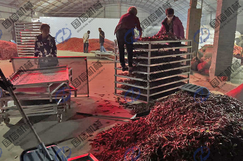 近日,許昌長葛的客戶在我公司購買的空氣能辣椒烘干房已經投入使用,并開始盈利。目前,設備運行順暢并得到客戶的一致好評,下面是工作人員拍攝的辣椒烘干加工現場圖片。