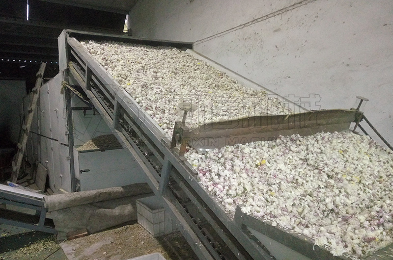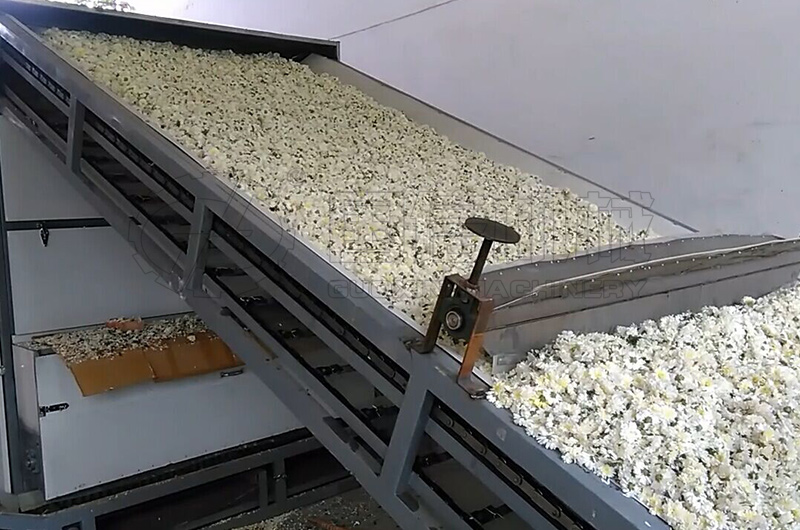 新鮮菊花的烘干我們用無硫烘干法,設備采用網帶式穿流干燥機進行烘干,通過自下而上穿過網帶及物料層的熱氣流使菊花花朵溫度升高,均勻干燥。